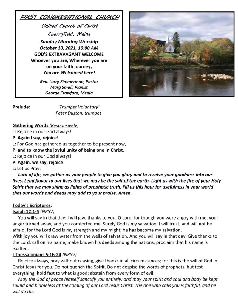 Happy First Sunday of October! All are welcome to attend our 10 AM service this Sunday, October 5, 2025 at the Cherryfield Congregational Church. Coffee Fellowship will follow the service. Communion will also be served
