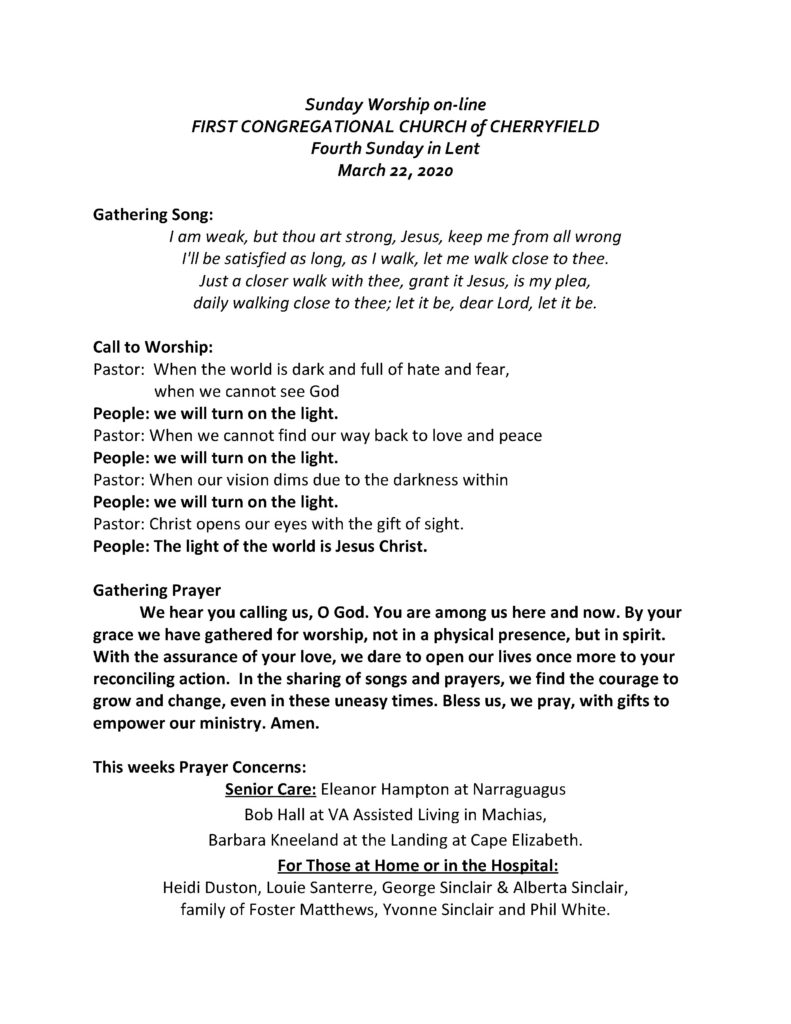 As posted below, The First Congregational Church of Cherryfield is closed until At LEAST until April 1st as we avoid large groups due to the COVID-19 outbreak. Over the period we are closed, we are going to be having a “virtual church”. We are not going “high tech” with streaming, but are posting what would have been our bulletin for this week with Rev. Larry Zimmerman’s message. It will be available as set of pictures. Keep the faith in the weeks ahead. Also stay healthy! Blessing and good thoughts to all!